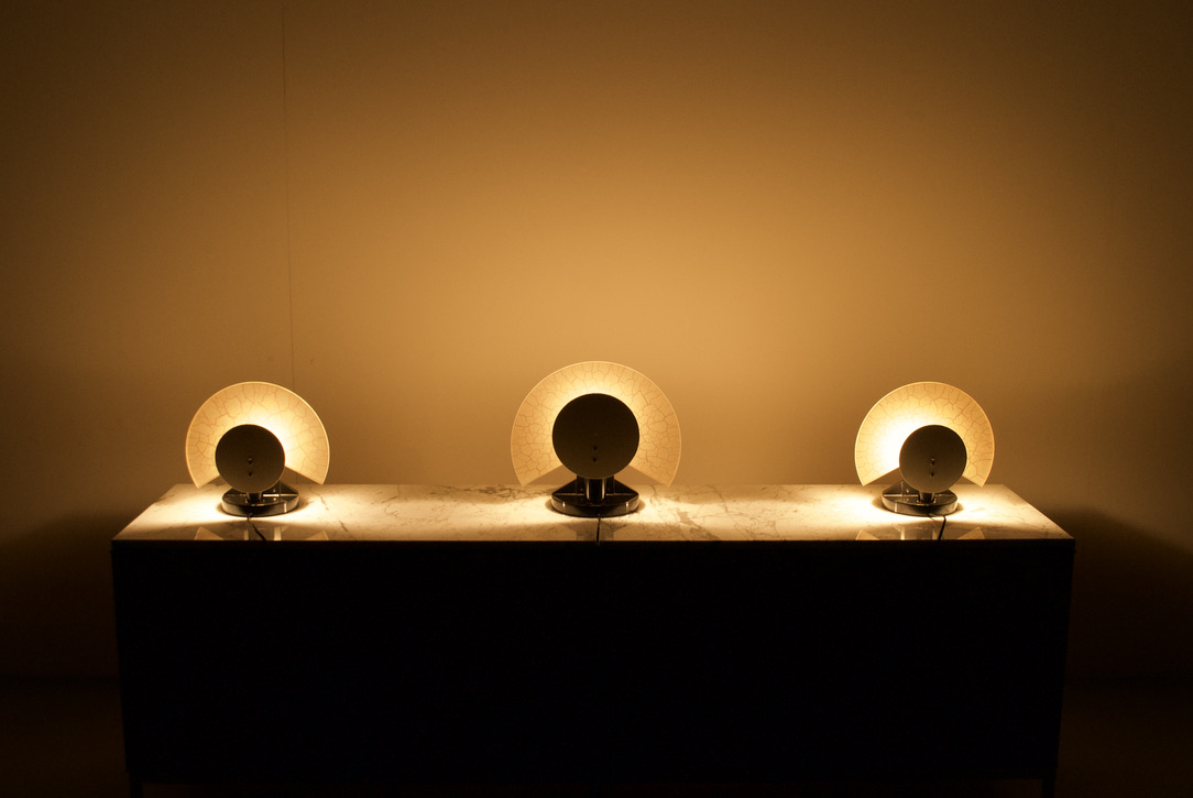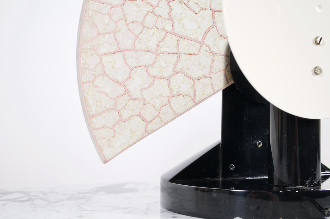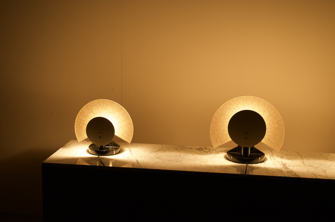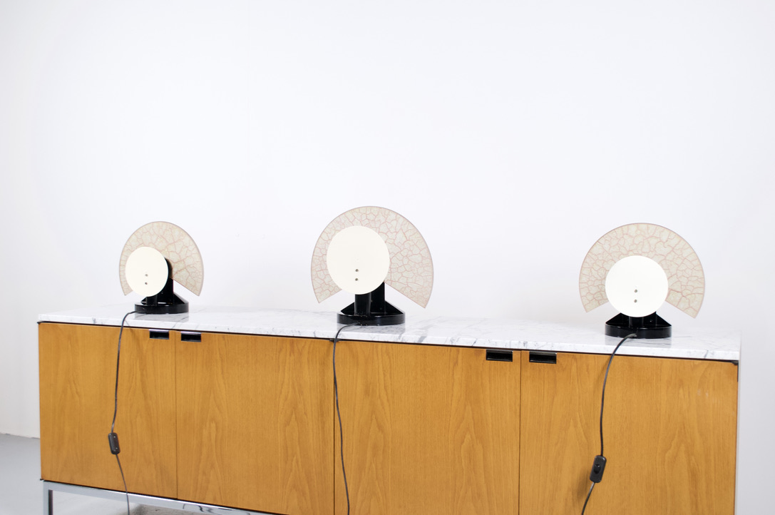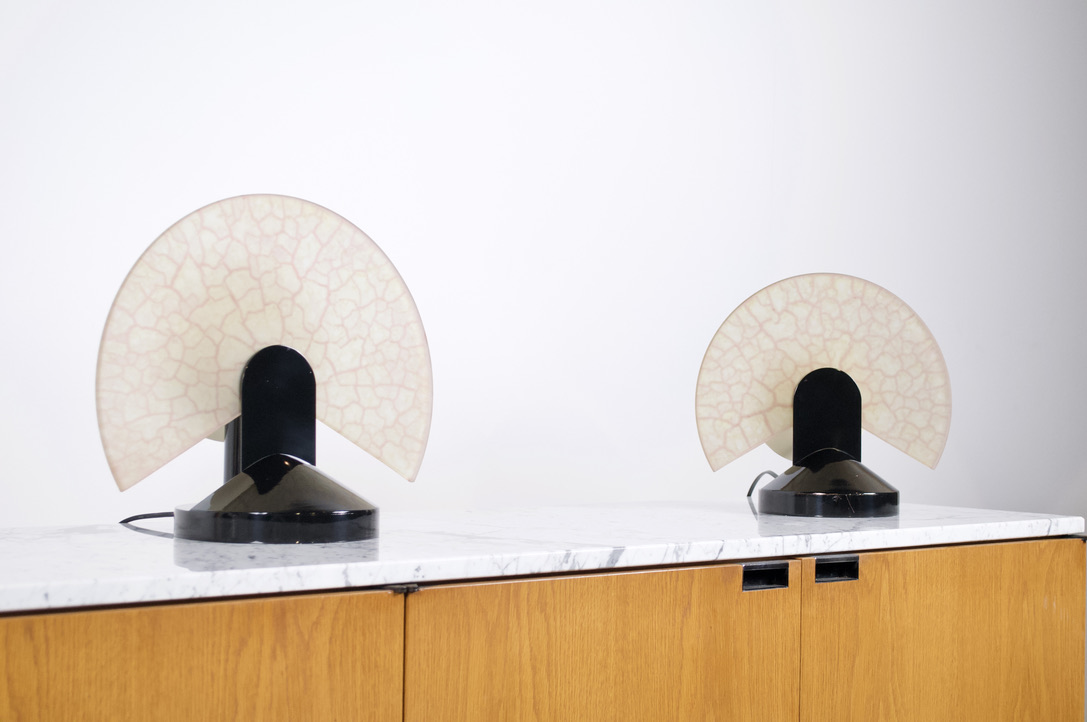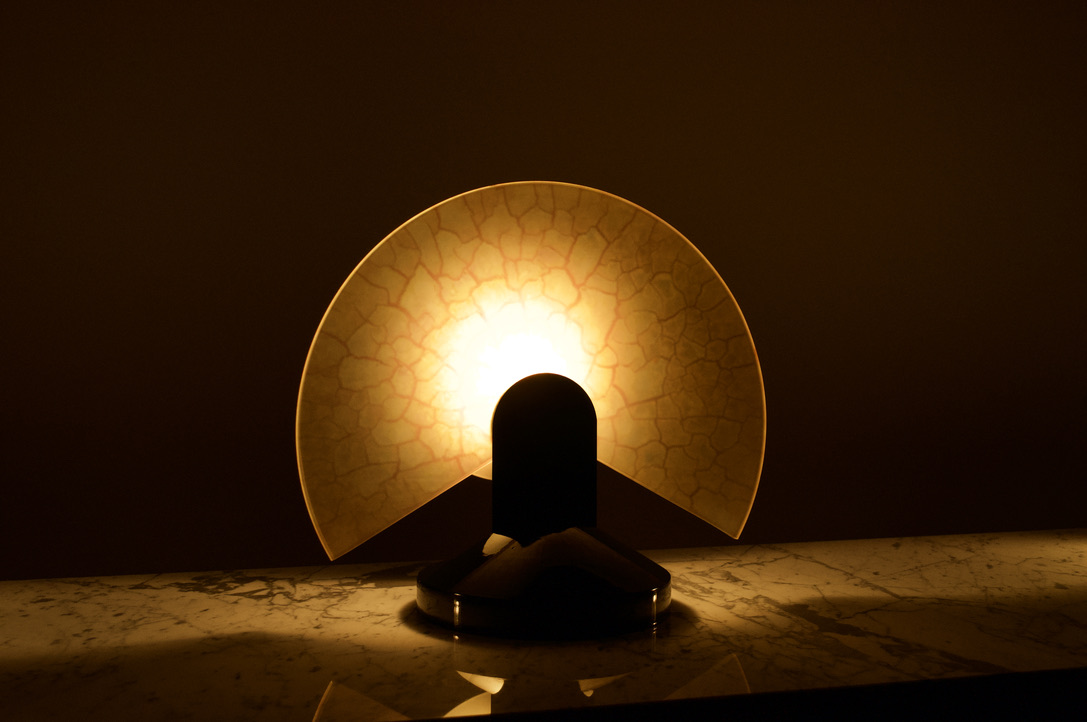 Base en acier laqué noir, dalle en verre de Murano effet vitrail et abat jour orientable en cier laqué blanc.