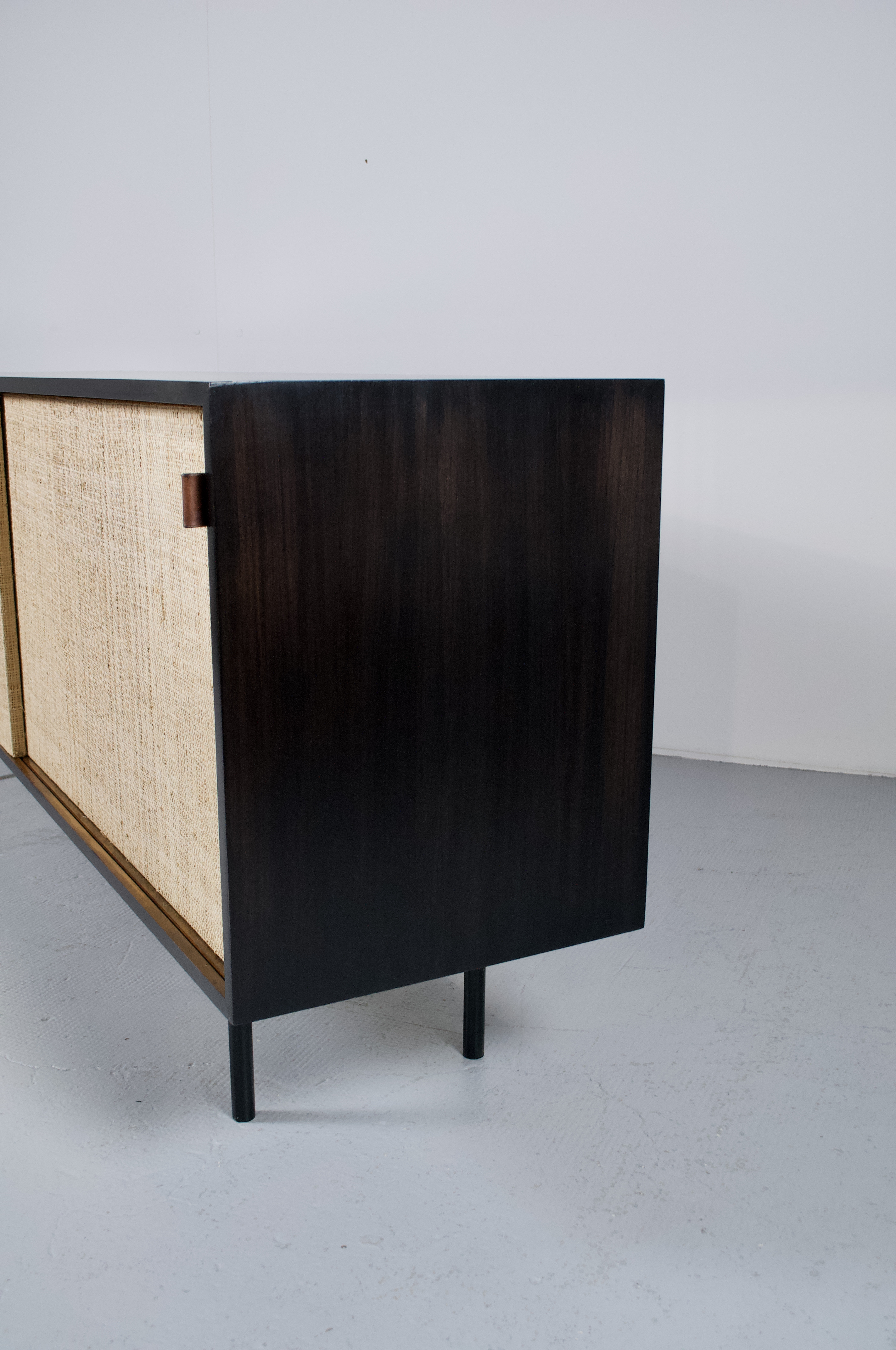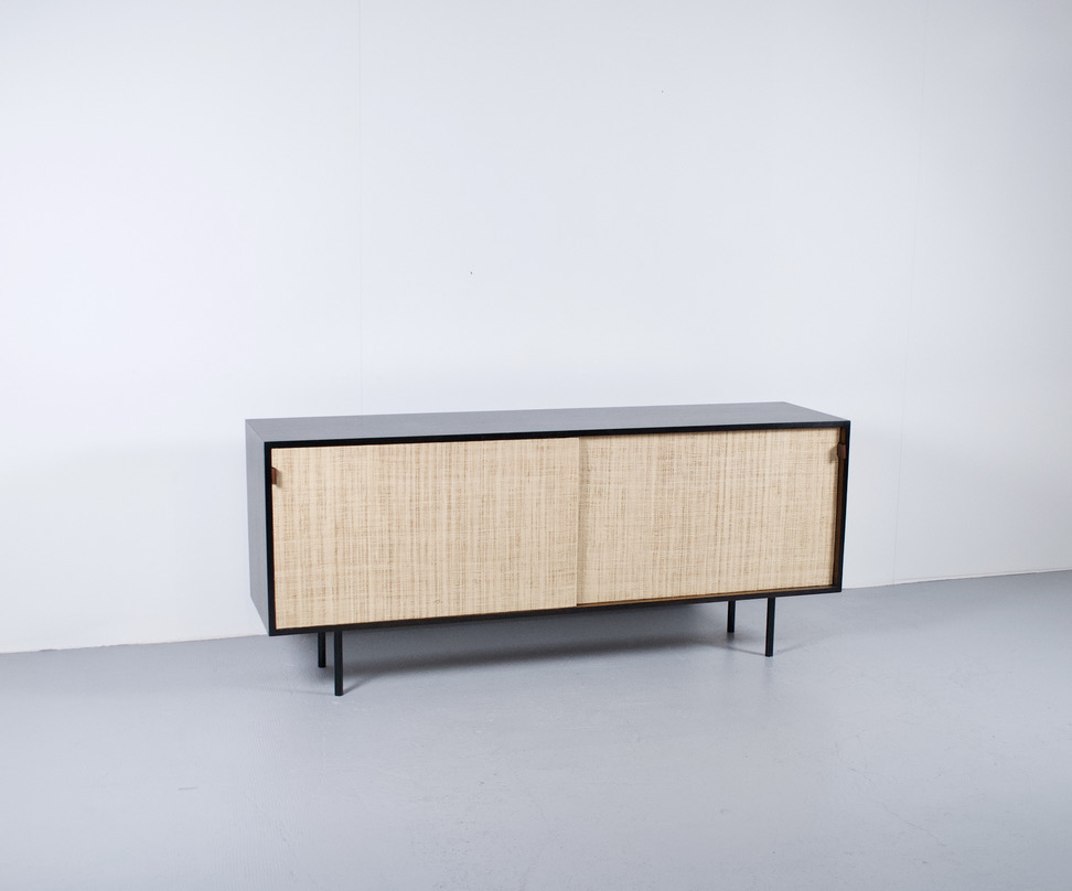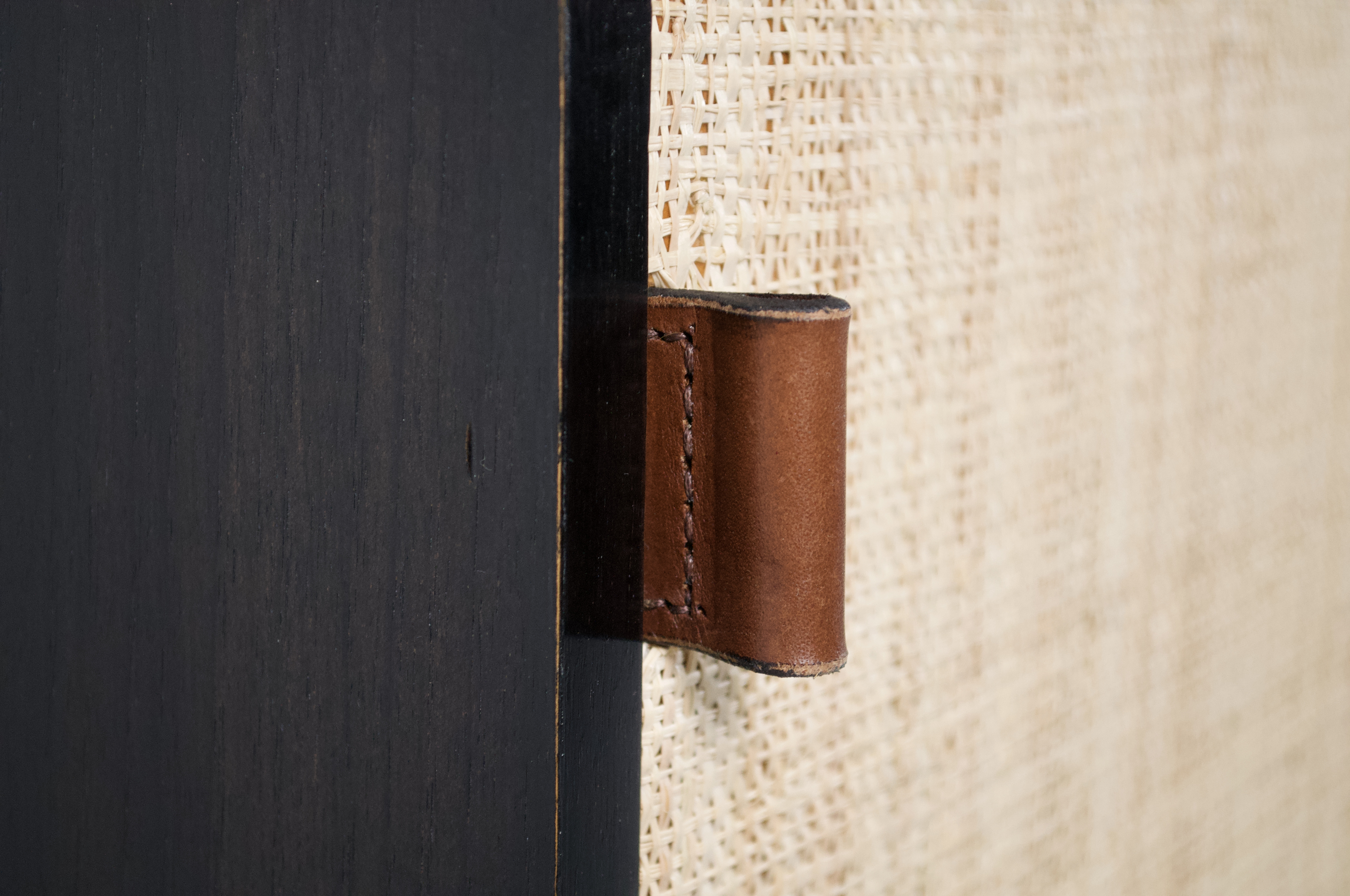 Piètement tubulaire en acier laqué noir, caisson en bois teinté noir, portes recouvertes de raphia et poignées en cuir marron.