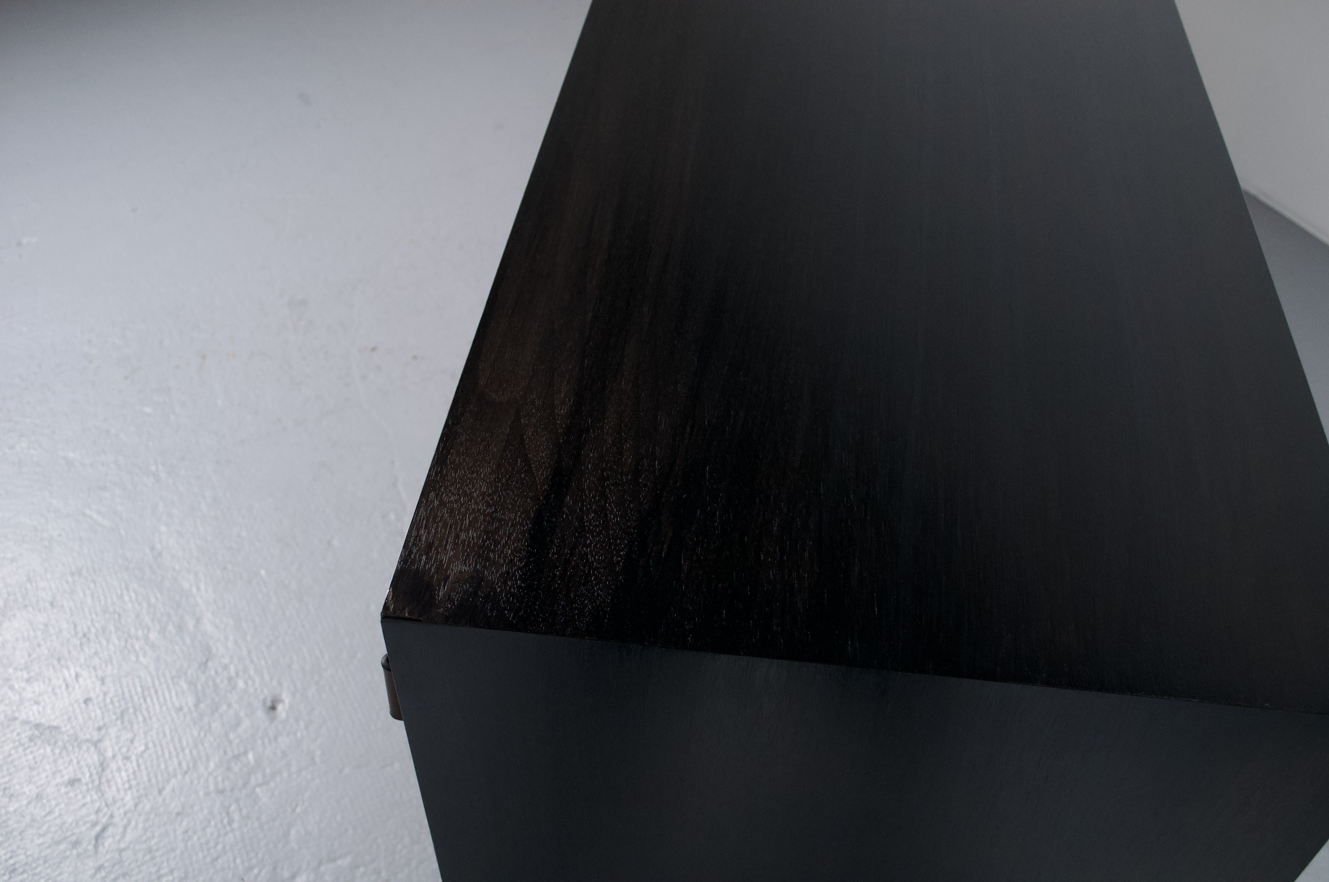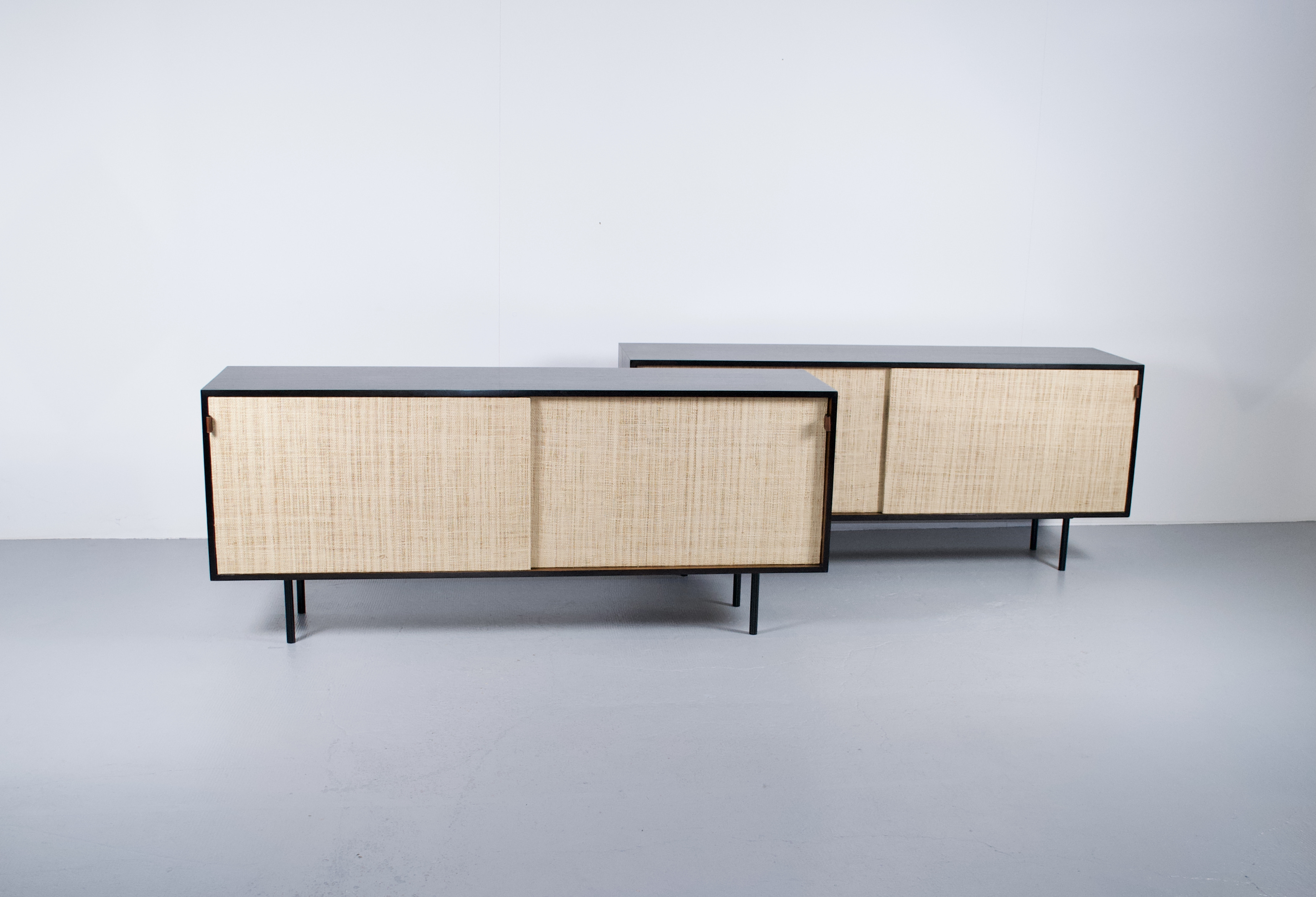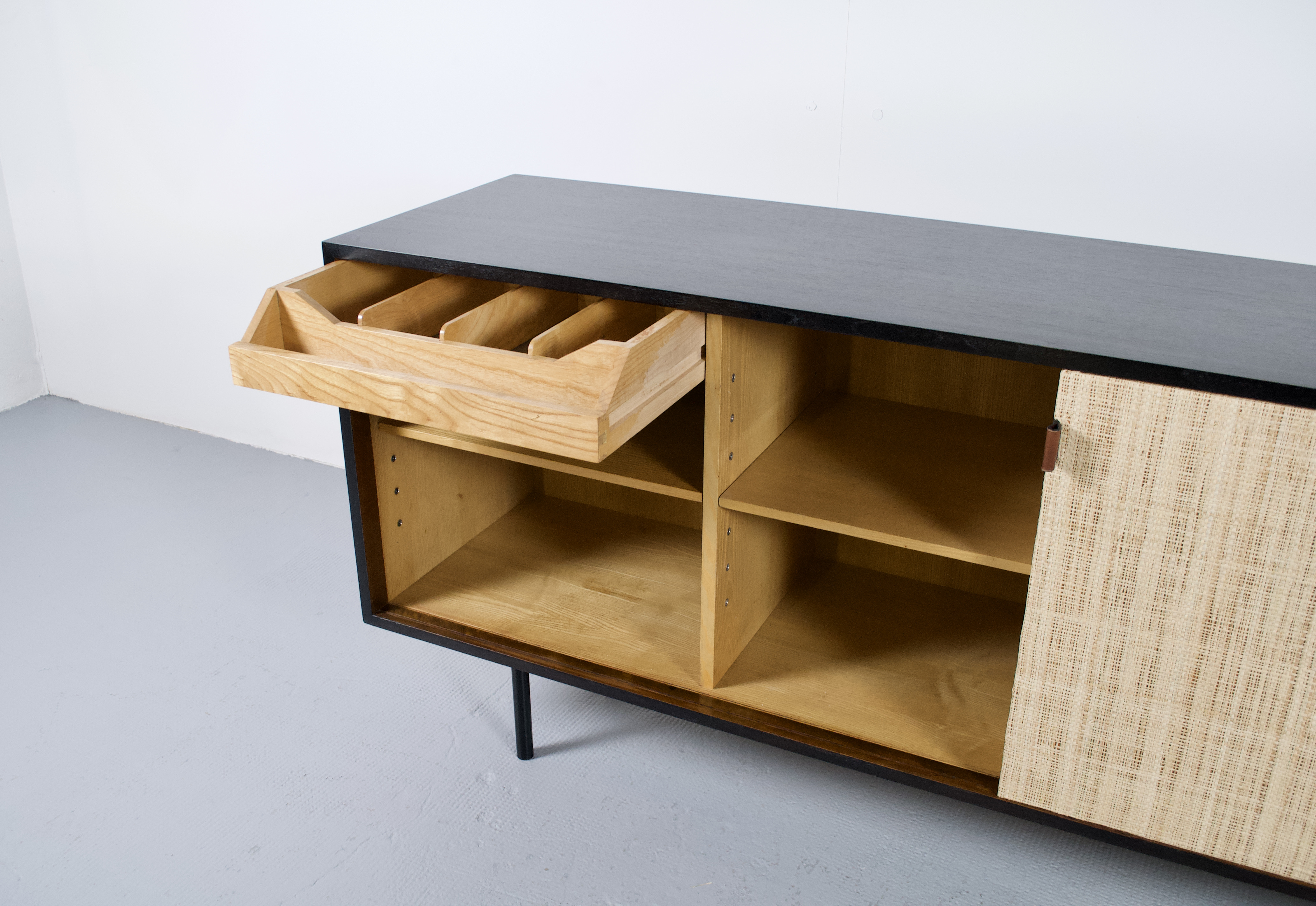 Piètement tubulaire en acier laqué noir, caisson en bois teinté noir, portes recouvertes de raphia et poignées en cuir marron.
