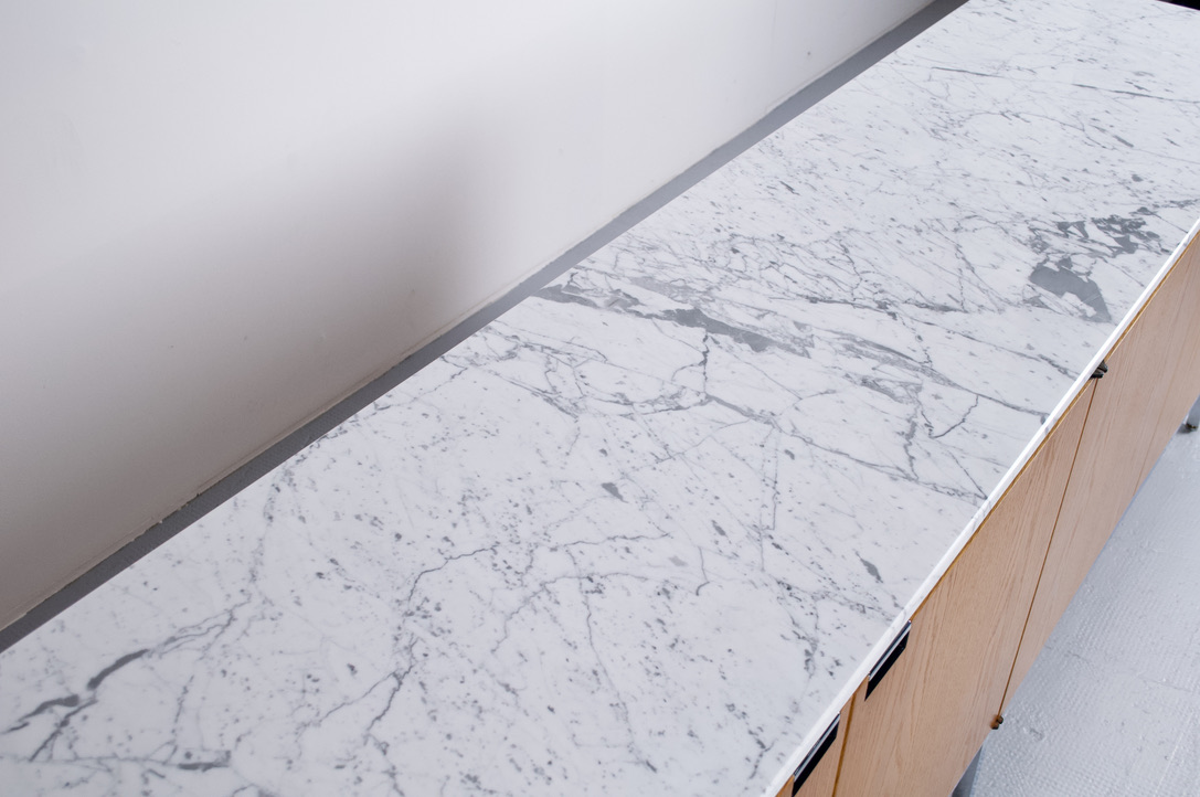 Piètement en acier chromé, structure en teck et plateau en marbre de carrare.