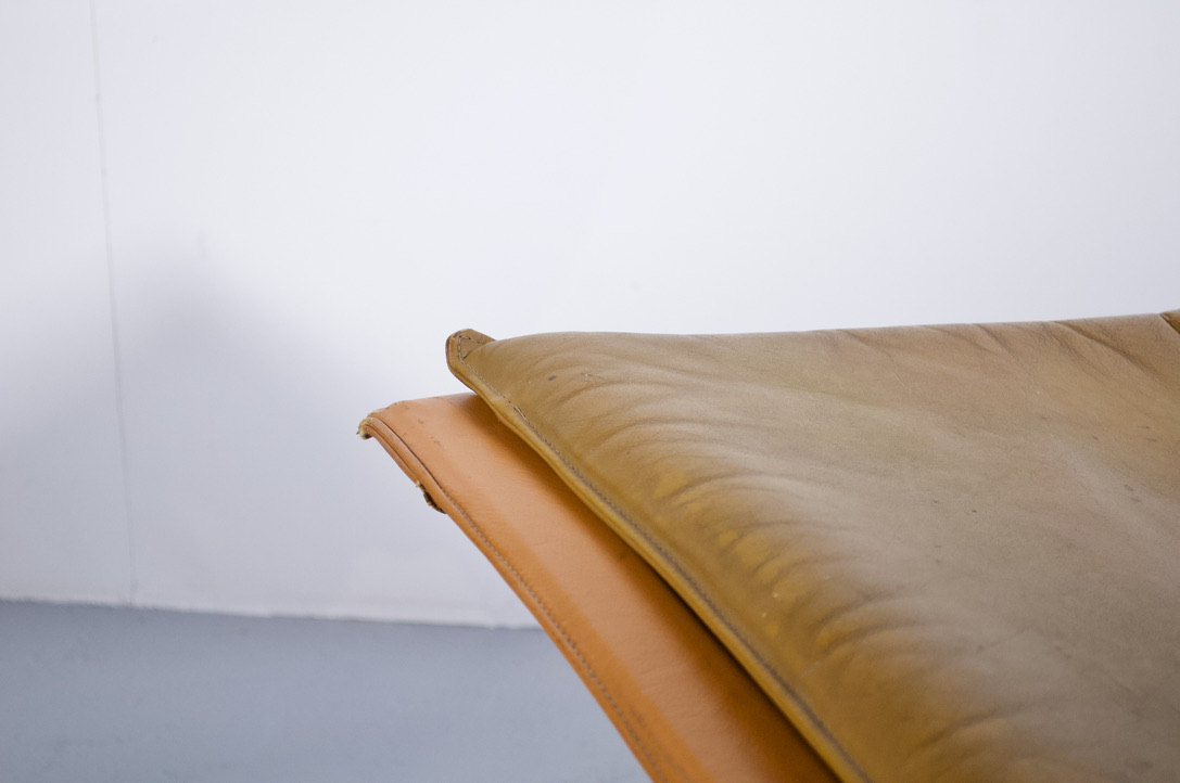 Piètement en acier et cuir camel pour le dossier, assise et coussins amovibles.