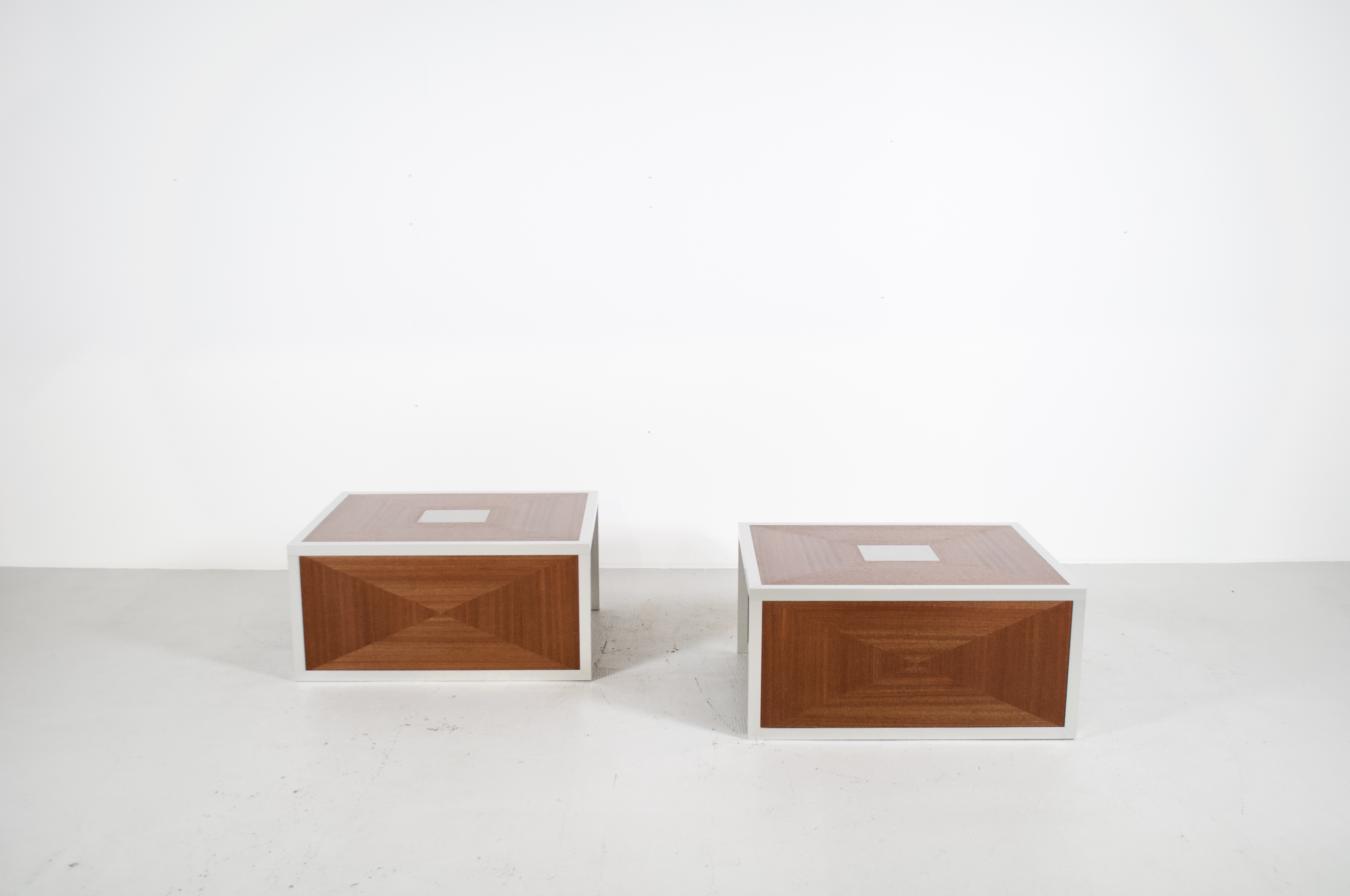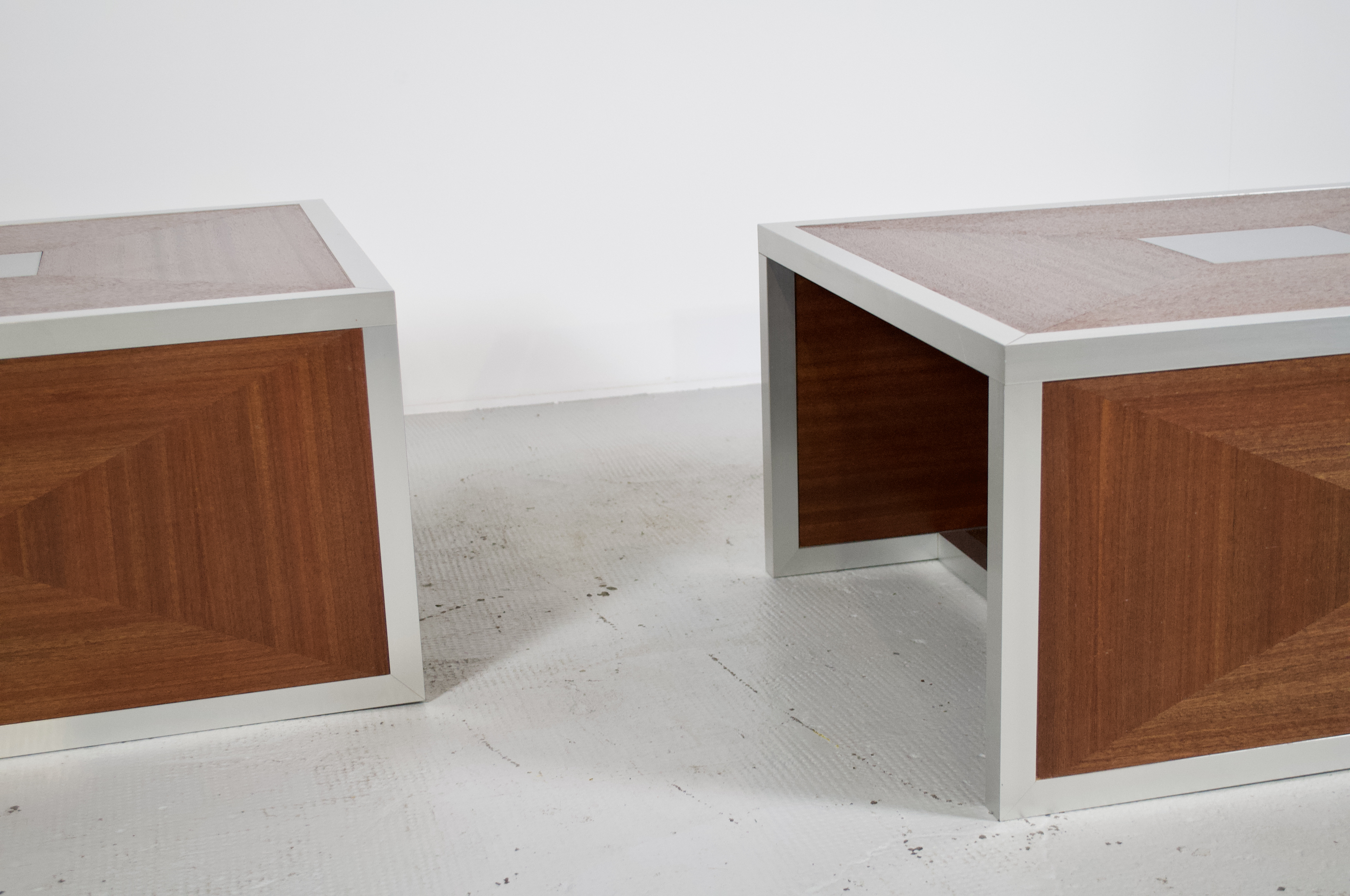 Encadrement en aluminium et faces en placage d'acajou façon marqueterie.