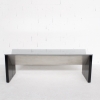 Piètement en bois laqué noir, métal brossé, 2 plaques de verre miroir et un plateau en verre cristal.